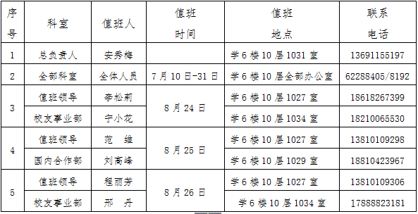 根据学校《关于2016-2017学年第二学期期末及暑假工作安排的通知》(校办发〔2017〕12号)文件要求,为确保相关工作顺利开展,结合实际,合作发展办公室、校友总会/教育基金会秘书处暑假值班安排如下: