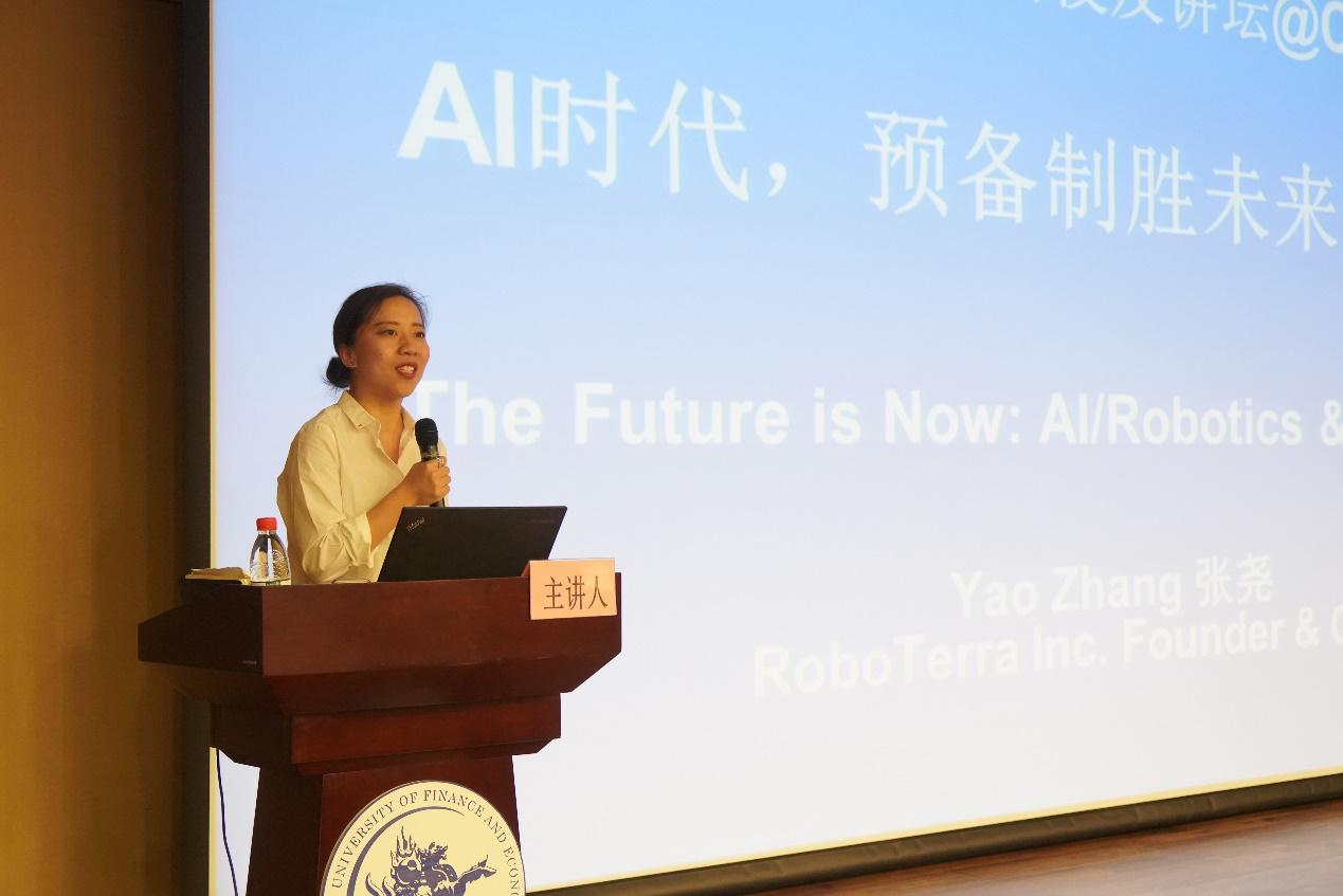 作为一个具有社会责任感的企业家,张尧校友一直以来都致力于通过机器人将更好的教育和未来带给更多的学生,用科技和创造推动世界进步。讲座中,张尧校友以“机器人大脑之AI碾压人类”、“时间与技术爆炸”、“火星登陆计划”以及多个鲜活的AI公司发展为例,介绍了人工智能行业的最新进展和特点。她认为,当前人工智能已经存在于人类生活的方方面面,所有的行业都与数据处理密不可分,未来也将被人工智能所引领,能够更有效利用人工智能的人才将成为紧缺人才。张尧校友强调,AI时代是一个快速发展、产品技术不断更新、产品性质不断变迁的时代,尤其需要能够快速学习、调整和变化的人才,同学们绝对不能用过去的思维去找未来的工作,而应用未来的思维去寻找未来的工作,用未来的思维去塑造未来的自己。最后,张尧校友表示,希望能助力母校事业发展和人才培养,将中央财经大学打造成为AI时代的人才黄埔。