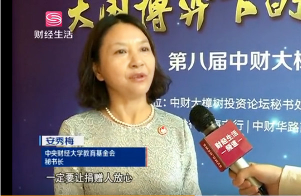 在第八届中财大樟树投资论坛上,中央财经大学教育基金会秘书长安秀梅接受了深圳电视台记者采访。